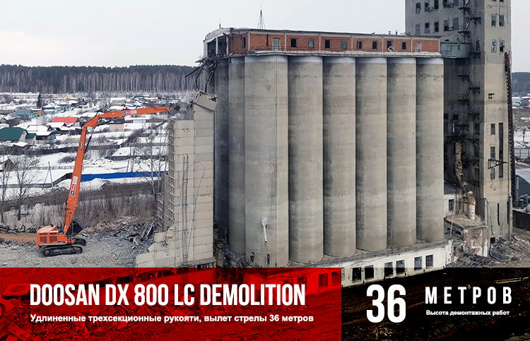 Демонтаж элеватора зерноподачи высотой 36 м демонтажным экскаватором-разрушителем