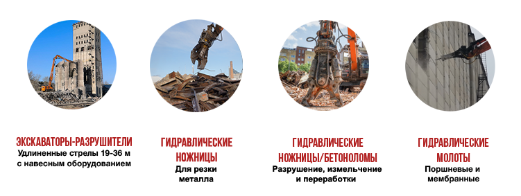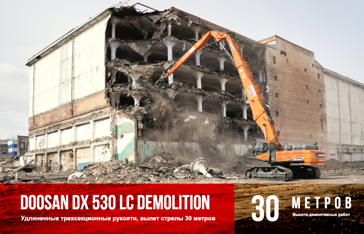 Группа Промышленных Компаний «DeStroy» предоставляет в Аренду уникальные по своим техническим характеристикам демонтажные экскаваторы-разрушители DOOSAN DX 800 LC DEMOLITION, DOOSAN DX 530 LC DEMOLITION, VOLVO 480 DEMOLITION, DOOSAN 300 (LONG REACH), DOOSAN 255 (LONG REACH), HITACHI EX 270, VOLVO EC 290 (LONG REACH) с гидравлическими ножницами, предназначенные для сноса высотных зданий и промышленных объектов. Все экскаваторы оснащены удлиненными трехсекционными стрелами, высота демонтажных работ которых, составляет от 20 м до 36 м, что с уверенностью позволяет выполнять сложный демонтаж зданий высотой в 12 и более этажей.