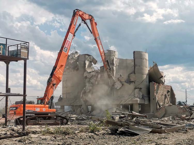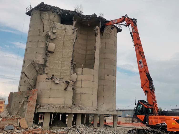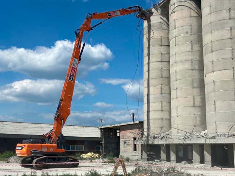 Механизированный демонтаж склада цемента на 400 т с применением уникального по своим техническим характеристикам экскаватора-разрушителя. Экскаватор оснащен трехсекционной удлиненной стрелой и полноповоротными гидравлическими ножницами-бетоноломами.