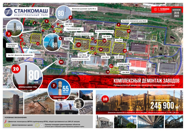 Снос производственных цехов №9, №22, №23, №25, №28, №30, №33, №34, , котельной и кирпичной дымовой трубы высотой 80 м.