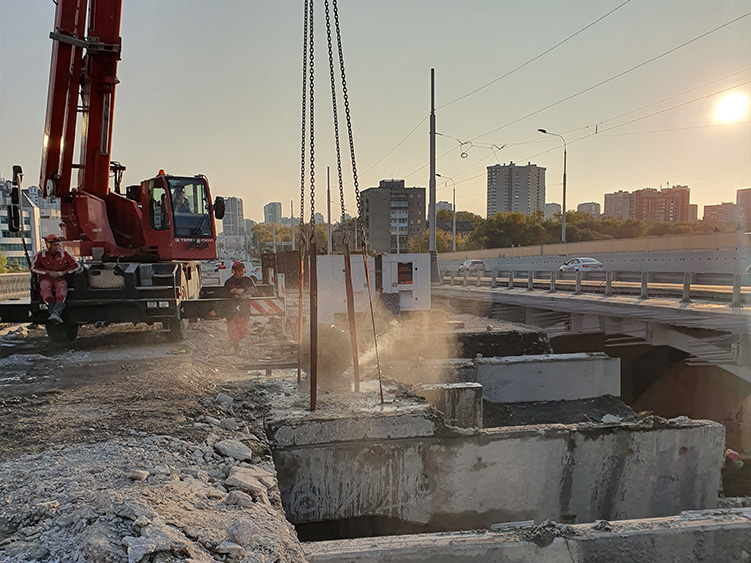 - Демонтаж Ж.Б. конструктивных элементов моста с применением тяжелой спецтехники (краны LIBHER LTR 1100, грузподъемностью 100 т; TEREX-DEMAG, грузоподъемностью 250 т);