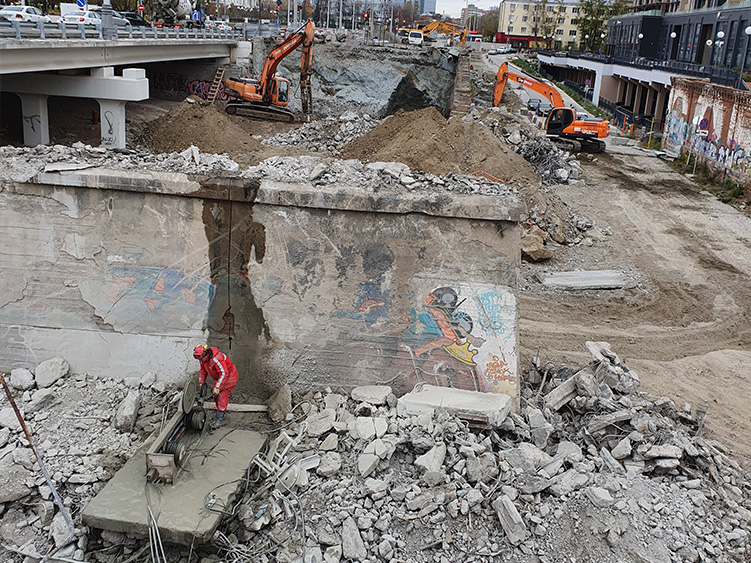 - Размельчение Ж.Б. элементов экскаваторами с гидрормолотами, вывоз и утилизация демонтируемых элементов;
