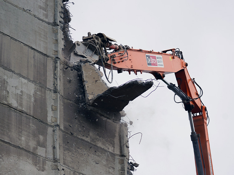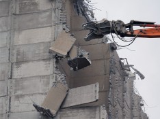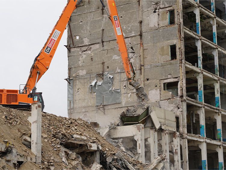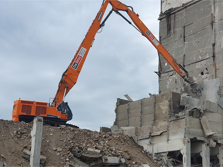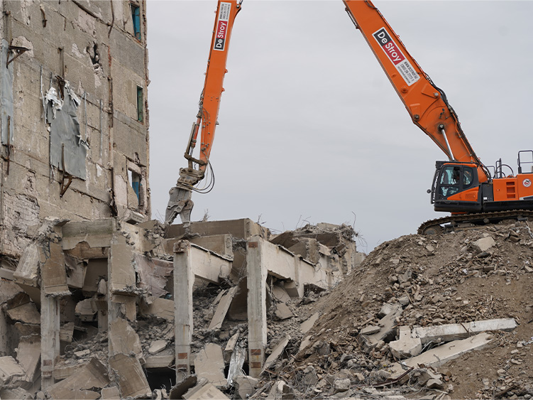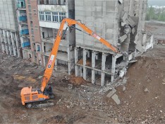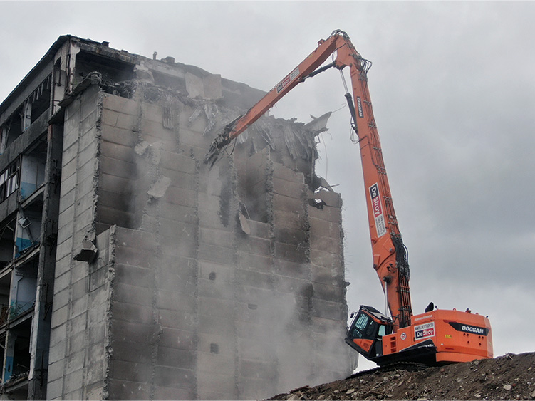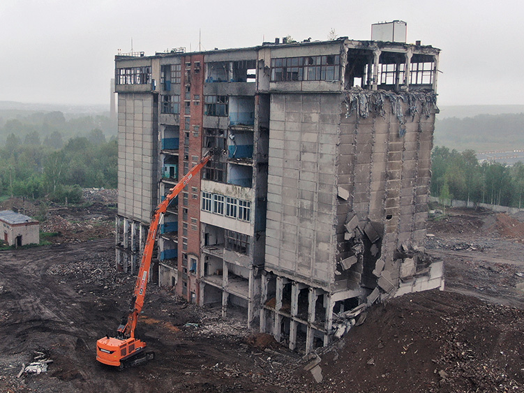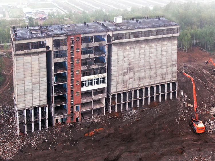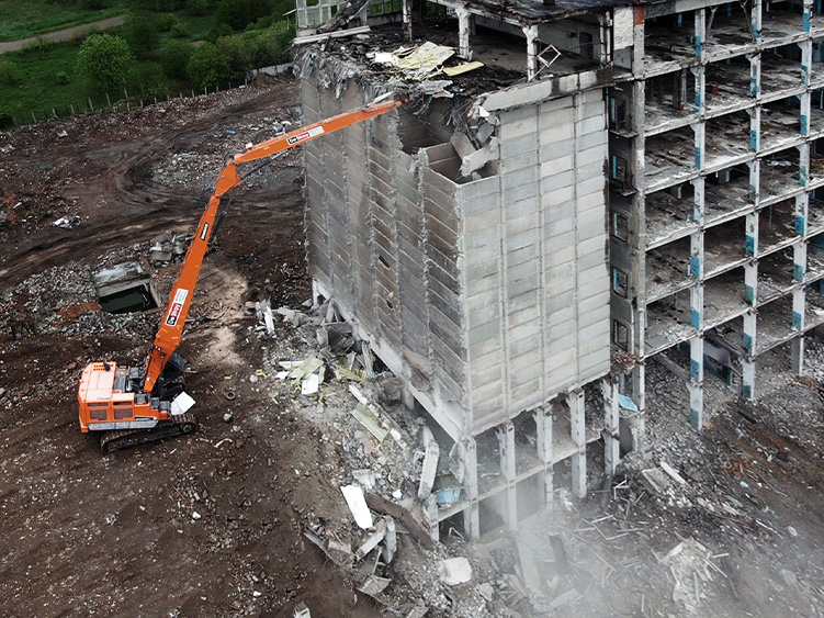 Снос 11 этажного многоквартирного дома с применением демонтажного экскаватора-разрушителя