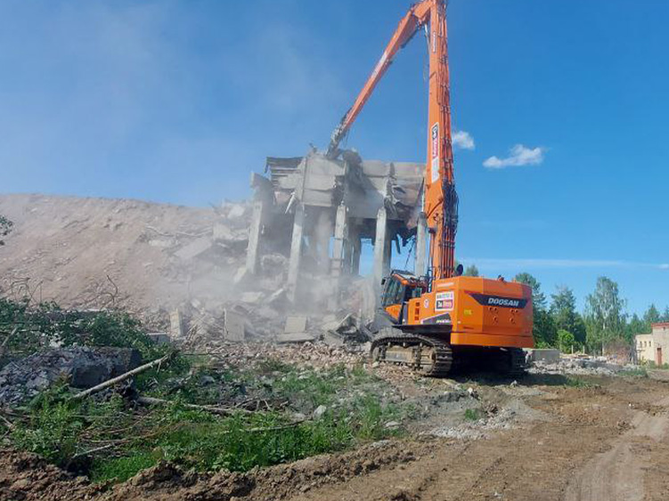 Механизированный демонтаж комбикормового завода c применением уникальной по своим техническим характеристикам демонтажной спецтехники. Использовался Doosan DM 800 Demolition c гидравлическими ножницами и вылетом стрелы 37 метров.